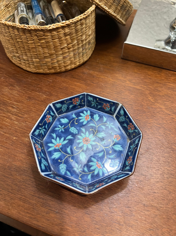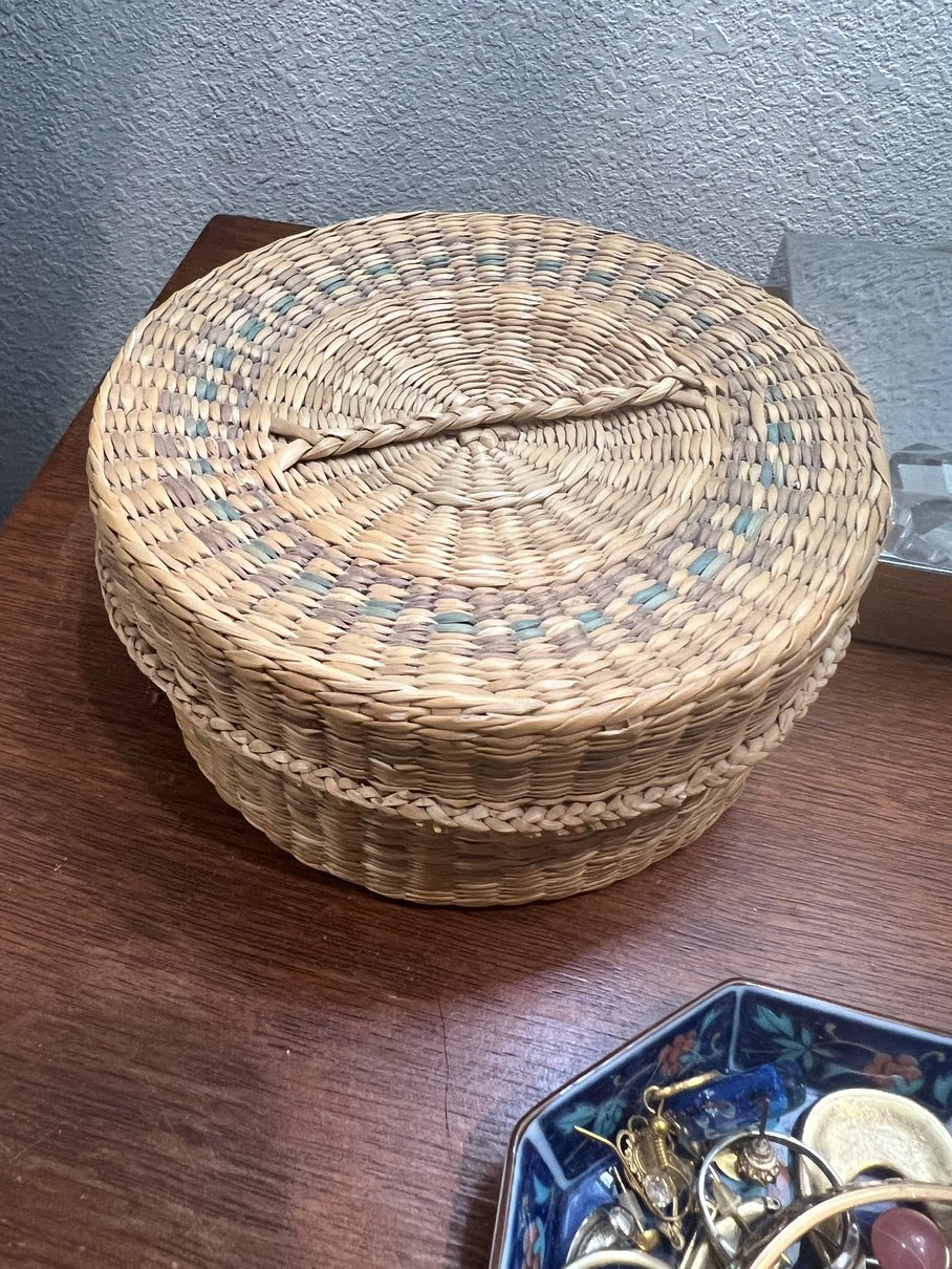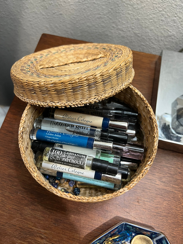 My nightstand holds two treasures that I enjoy seeing every day. My Aunt Jeanie's small decorative plate and my Grandma's pine needle lidded box. Holding jewelry and small perfumes are the perfect use for these treasures.